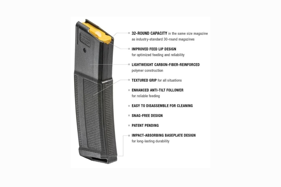 32-round capacity in the same size magazine as industry-standard 30-round magazines